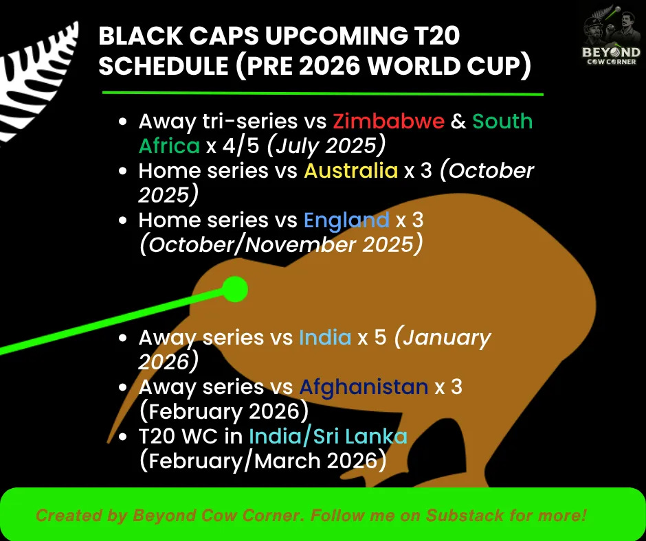 The Black Caps will now take a 52-day break from action (a sparse schedule for New Zealand? Well, I never) before returning in a three-match home T20 series against Australia between Oct 1-4, as preparations for the 2026 T20 World Cup begin ramping up.