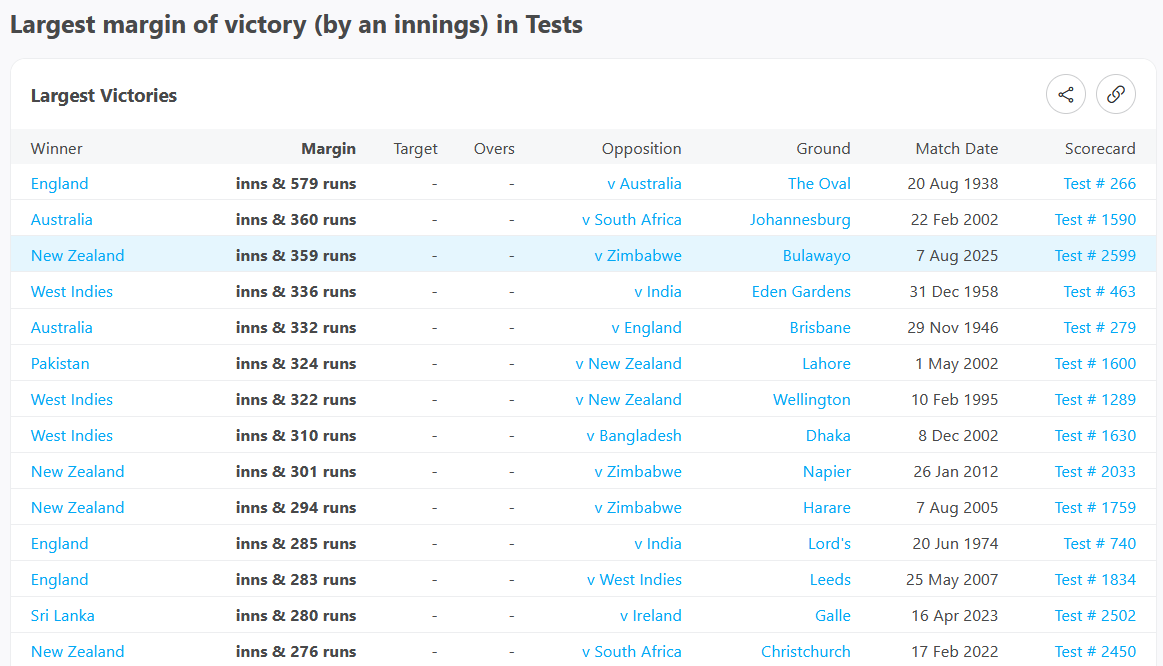 The win bested the team’s previous record victory margin of an innings and 301 runs, also against Zimbabwe in 2012 The Black Caps’ largest Test victory against a team other than Zimbabwe remains our win by an innings and 276 runs against South Africa in 2022 (a fully-loaded South Africa, too, not the SAD team from 2024).